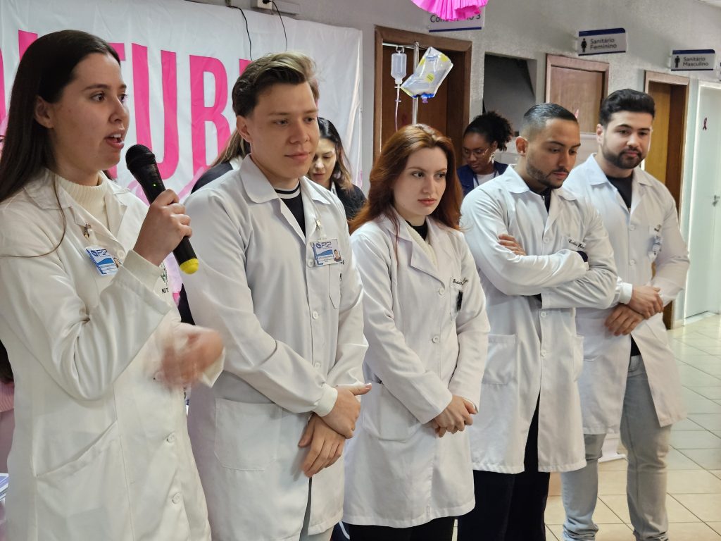 Em mais uma ação da campanha do Outubro Rosa, a Unidade de Tratamento do Câncer do Hospital da Providência promoveu uma atividade especial voltada à alimentação saudável, com a participação dos estudantes de Nutrição da Faculdade de Apucarana, acompanhados pela preceptora Luana Bérgamo e da nutricionista Ana Emília Marques.